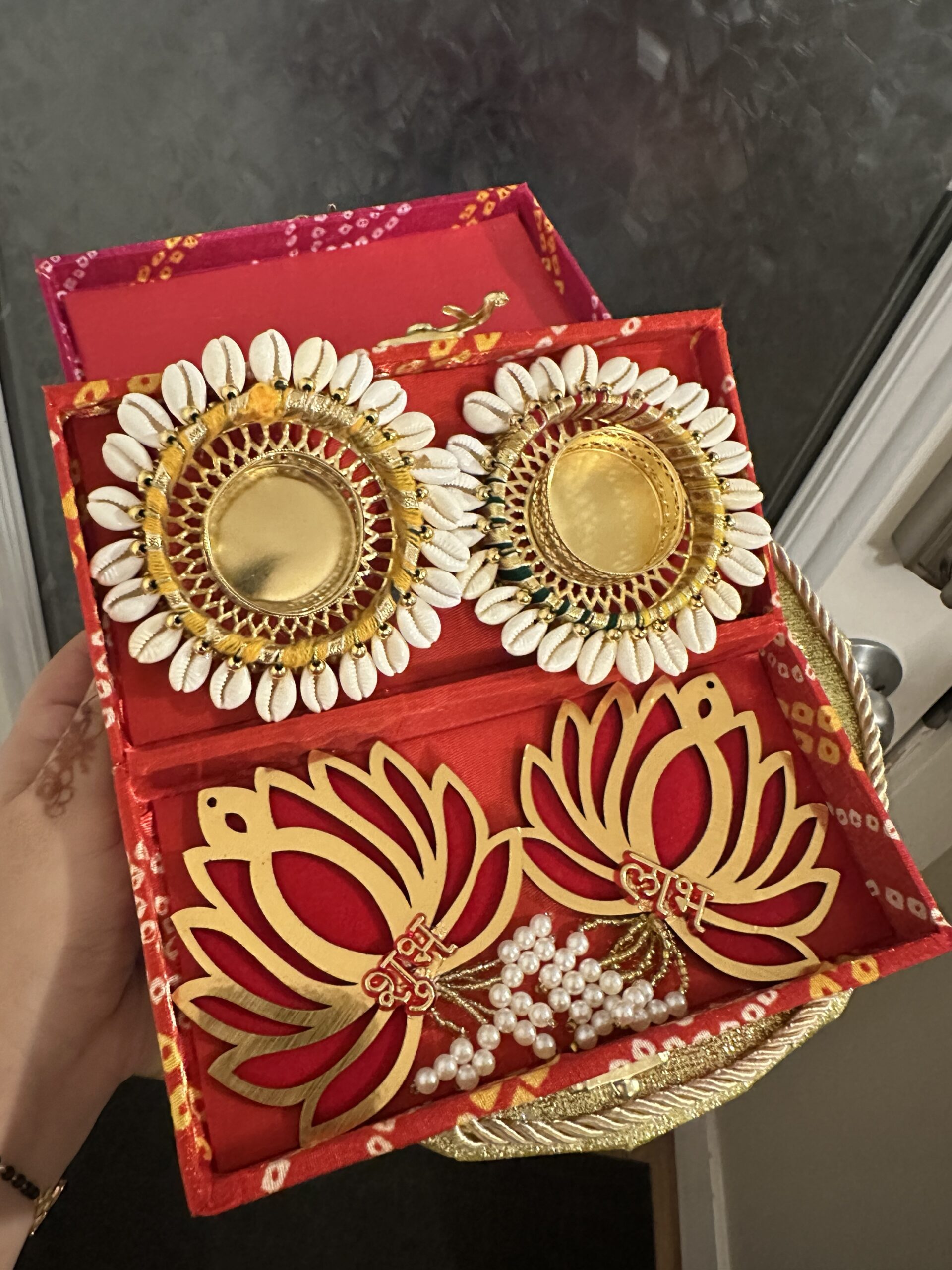 Ideal fr small gifting on diwali. Has a pair of shubh labh and a pair of tea lights
